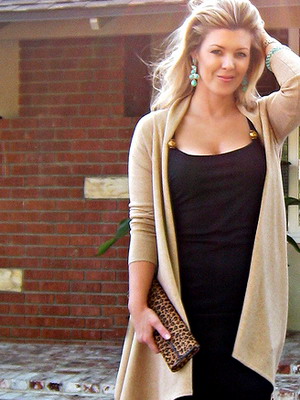 - Трикотажное платье плюс объемный кардиган крупной вязки – здесь акцент также делается на контрастном сочетании. Особенно удачно в рамках такого образа будет смотреться удлиненный кардиган, украшенный объемными деревянными пуговицами. В качестве яркой детали к образу можно выбрать эффектную обувь или сумку необычной формы.